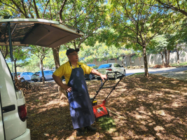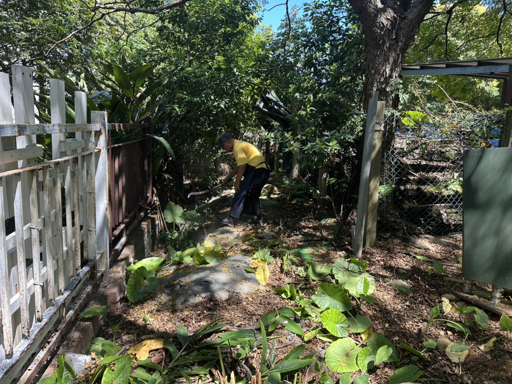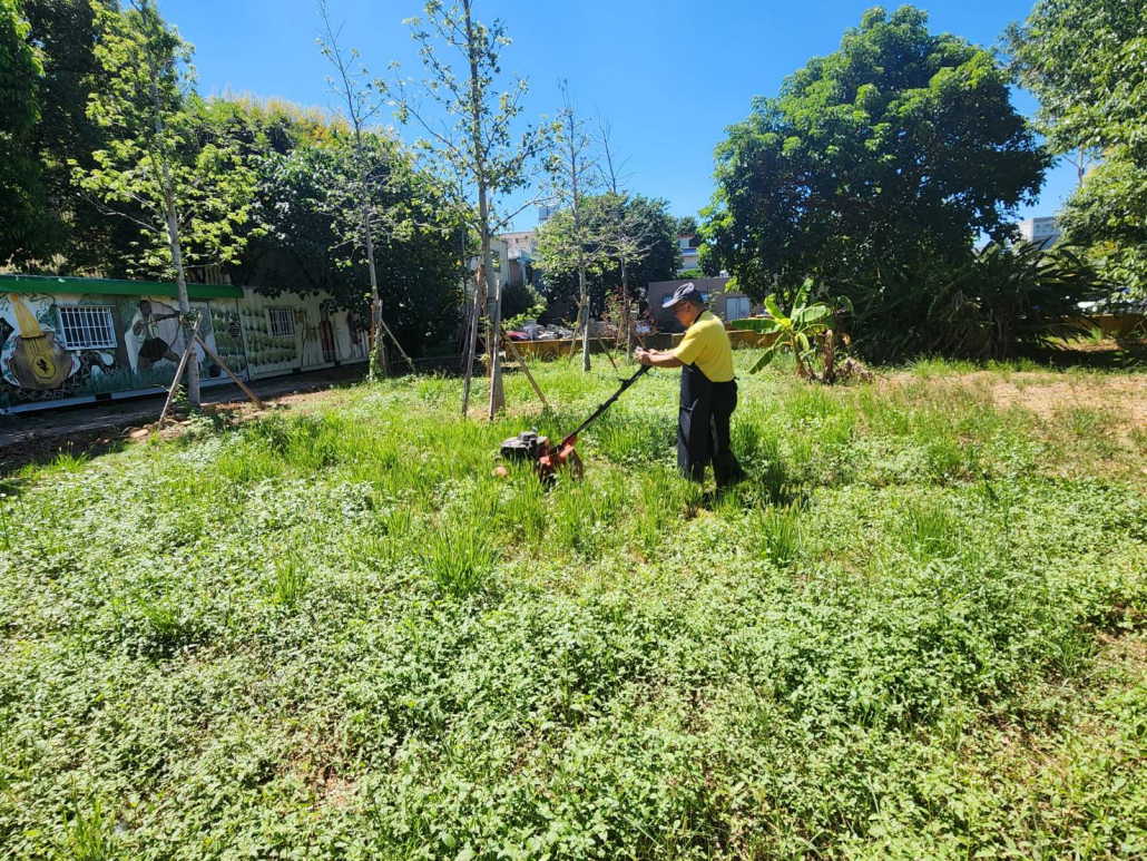 在本學期的木雕創作課程中,王賢老師不僅在中原大學「信實基地」帶領學生進行木雕工藝的實作,更以實際行動融入環境教育與保護的精神。課程過程中,王老師身穿工作圍裙,帶領學生投入環境整理與除草工作,從修剪枝葉、整理植栽,到清理基地環境,以親身示範詮釋了「工藝創作」與「生態永續」相輔相成的教育理念。