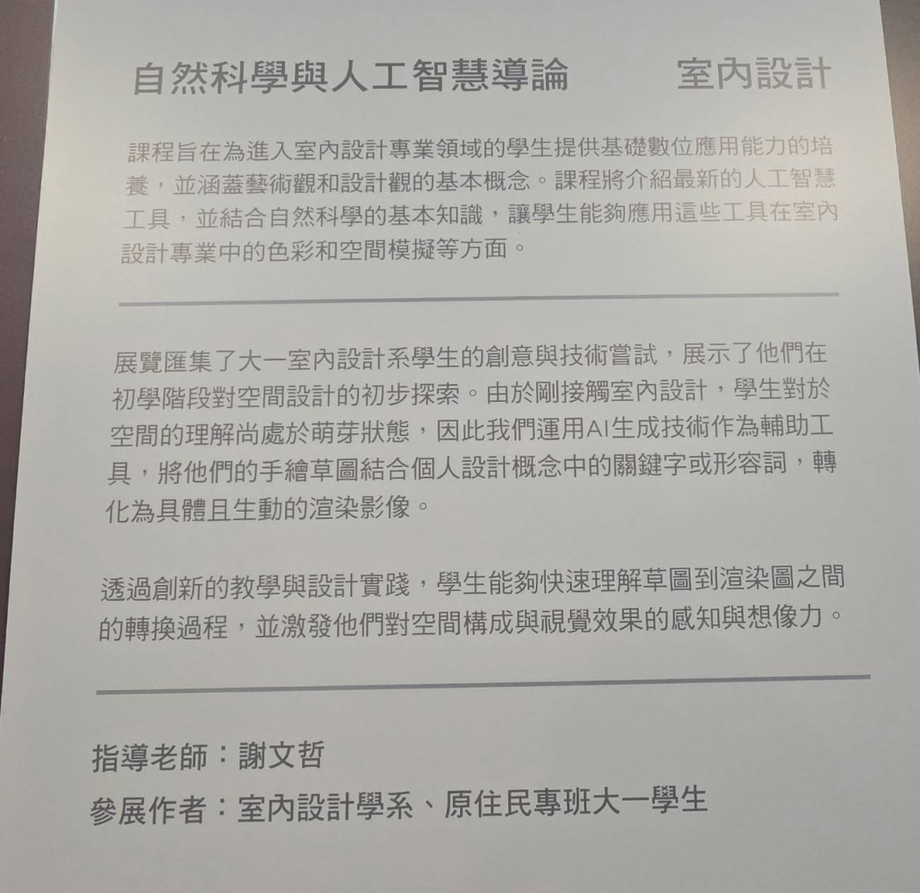 本展出將於12月16-25日在維澈樓行政辦公室舉辦教學學習成果公開展覽,原專班主任魯瑪夫博士表示,展出室內設計學系及原住民專班學生一年來的課程成果。本次展覽作品展現了學生的創新能力與專業技能,充分體現其在學習過程中的專注與努力,表現十分亮眼。展覽旨在分享學生的學習成就,並讓更多人認識室內設計與人工智慧技術結合的可能性與價值。