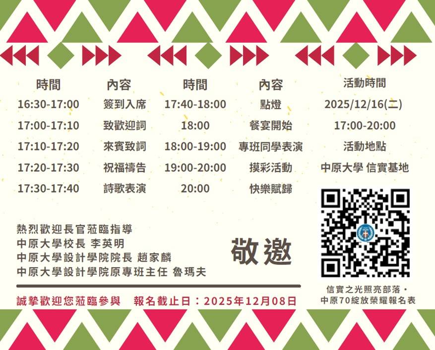「這場聖誕節的點燈活動,不只是歡慶節日,更是中原大學堅持基督教信仰為中心的重要延續。對設計學院原住民專班而言,信仰與品格教育是我們最核心的價值。我們盼望帶領學生在創意與文化中成長,也在信仰與生命中扎根,使光照亮部落、祝福城市、連結世界。」
