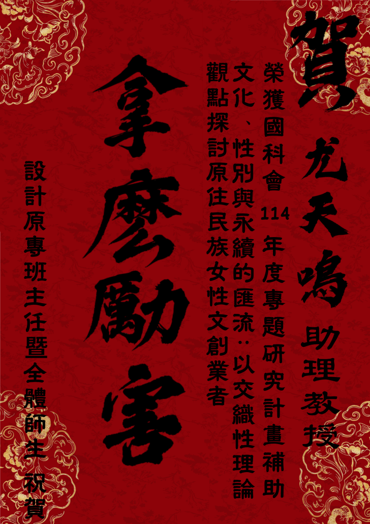 尤天鳴助理教授長期耕耘社會科學與原住民族相關研究,治學扎實,關懷社會脈動,兼具學術視野與實務關懷。此次獲得國科會114年度專題研究計畫補助,實屬難能可貴,亦充分展現其在學術研究上的深厚基礎與持續投入之成果。