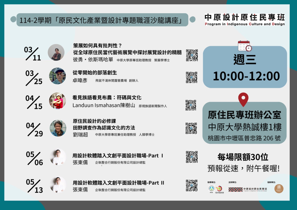 中原大學設計學士原住民專班於114學年度第2學期規劃辦理「原民文化產業暨設計專題職涯沙龍講座」,邀請來自策展、部落創生、族語文化傳播、人類學調查,以及設計實務等不同領域之專家學者與實務工作者,透過系列講座分享多元職涯經驗與文化實踐歷程。
